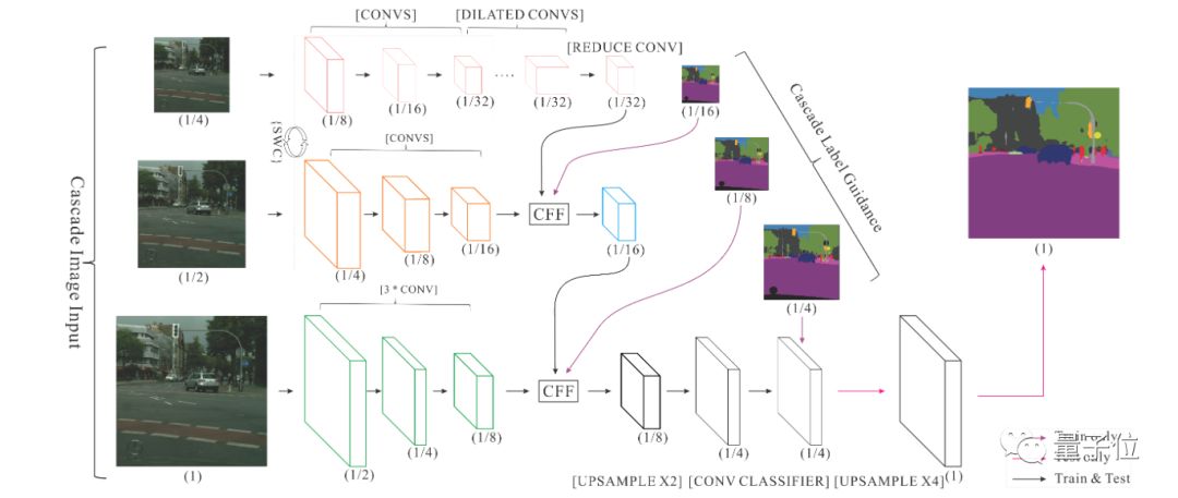 • ICNet,Image Cascade Network,主要用于图像实时语义分割,主要思想是将输入图像变换为不同的分辨率,然后用不同计算复杂度的子网络计算不同分辨率的输入,然后将结果合并。ICNet由三个子网络组成,计算复杂度高的网络处理低分辨率输入,计算复杂度低的网络处理分辨率高的网络,通过这种方式在高分辨率图像的准确性和低复杂度网络的效率之间获得平衡。