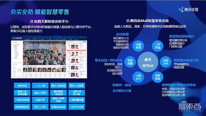 以安防需求为导向的优图天眼,支持亿级别库的人脸检索系统,毫秒级识别速度,目前已在福建省公安厅“牵挂你”防走失平台、苏州公安等成功落地,协助找回走势人口和实现车辆全城追踪。
