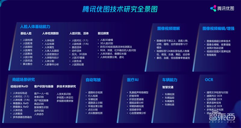 腾讯优图的技术研究以“计算机视觉AI”为基础,全面输出AI能力,着力成为腾讯云与智慧事业群的底层支撑。