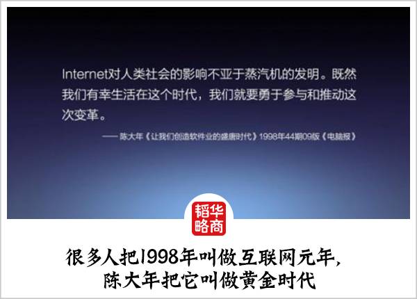 互联网让没上过大学的陈大年找到了人生另一种实现梦想的可能。1998年44期09版《电脑报》上,有这么一段话:“互联网对人类社会的影响不亚于蒸汽机的发明,既然我们有幸参与这个时代,我们就要勇于参与和推动这次变革。”