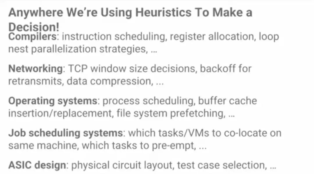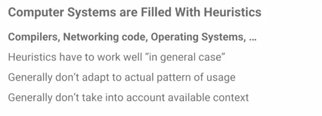 那么,除了数据库,ML还能使用在系统的哪些方面?一个很大的机会是启发式方法。计算机系统里大量应用启发式方法,因此,ML在用到启发式方法的地方,都有机会带来改变。
