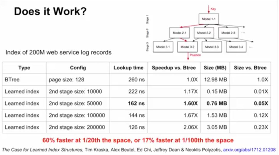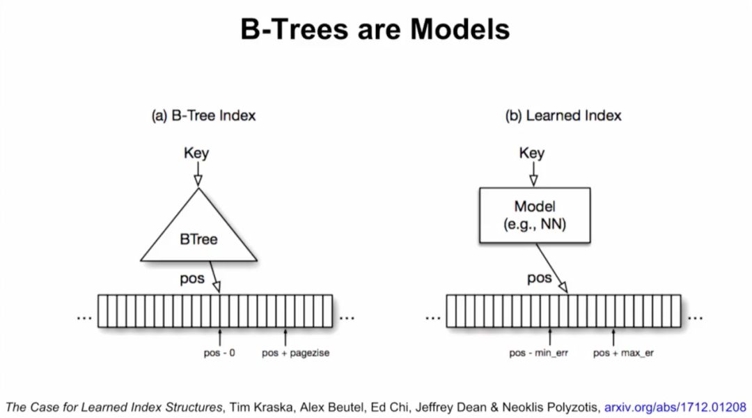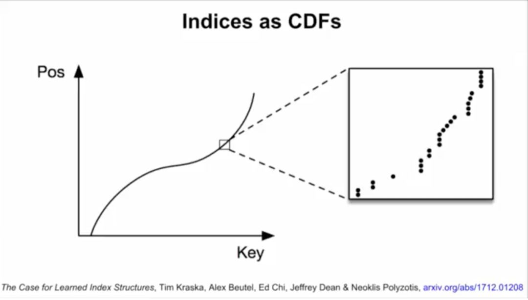 B-tree实际上可以看做模型。数据的累积分布函数(CDF)可以作为索引。举例来说,如果键的范围在0到500m之间,比起用哈希,直接把键当索引速度可能更快。如果知道了数据的累积分布函数(CDF),“CDF*键*记录大小”可能约等于要查找的记录的位置,这一点也适用于其他数据分布的情况。