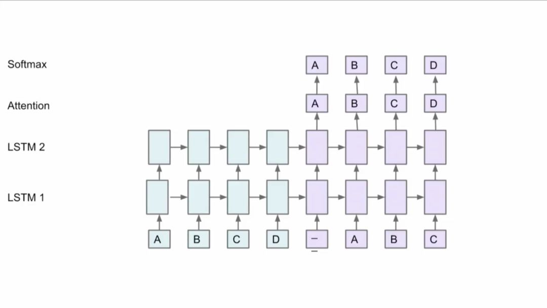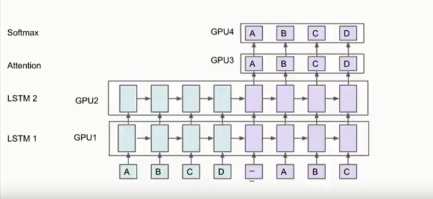 但是,如何将模型分布到不同机器上并且取得好的性能是很难的。Jeff Dean以下面这个网络为例,比如有两个LSTM,有Attention机制,在顶层有Softmax,你可以将方框中的部分放到不同的GPU卡上,因为这些部分都有同样的参数,这些层也不用移动。