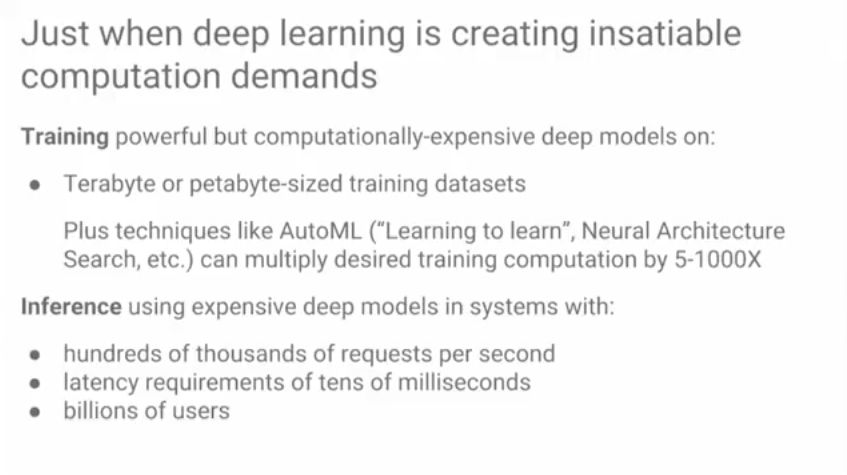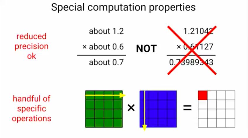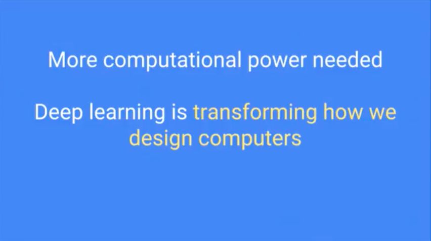 因此我们需要更多的计算力,而深度学习正在改变我们设计计算机的方式。深度学习具有的两种特殊计算性能:可以降低精度,浮点计算;出现了很多专门的深度学习模型运算。
