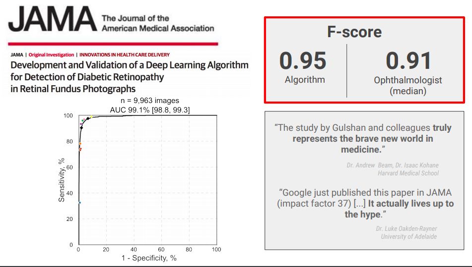 在健康问题上,谷歌用深度学习分析糖尿病视网膜图像,算法的准确率已经超越了人类医生。