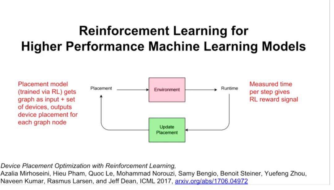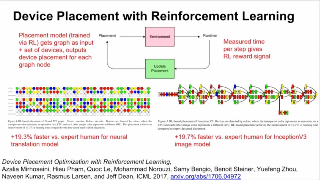 此外,谷歌大脑还在进行一项研究,用强化学习来替代一部分硬件上的计算。你将计算视为算子和dependencies组成的graph,然后给一组硬件,比如你想在4块GPU或者8块GPU上运行这个模型,结果整个过程成了很好的强化学习过程(见下图)。
