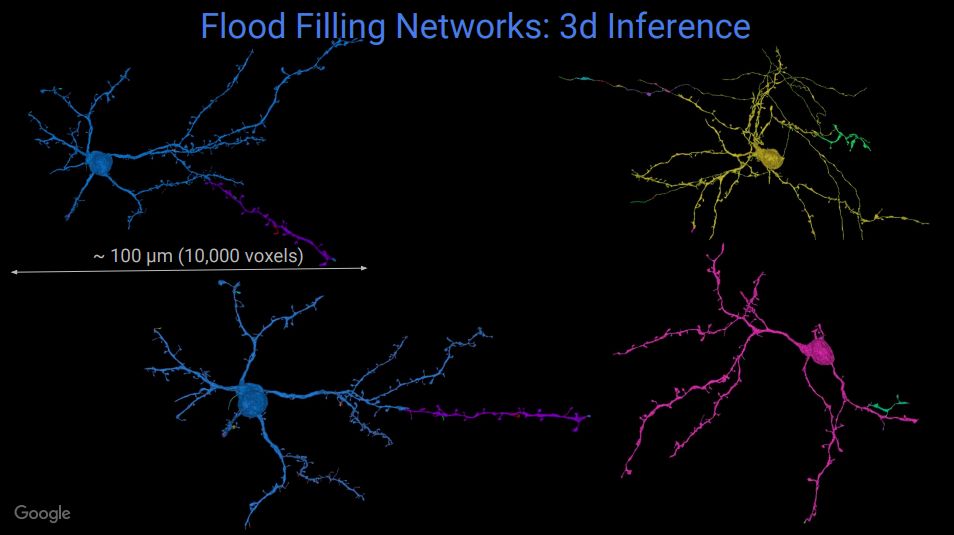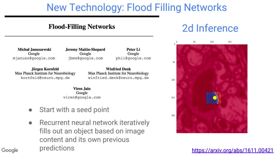 他们还提出了一种模拟生成神经网络的算法“Flood Filling Networks”,可以使用原始数据,利用此前的预测,自动跟踪神经传导。
