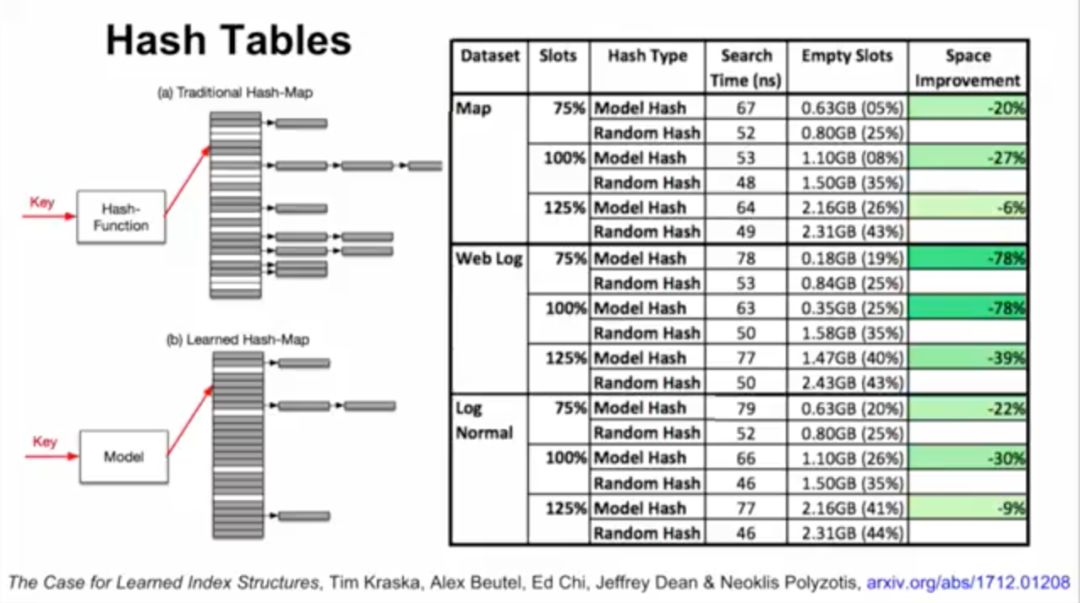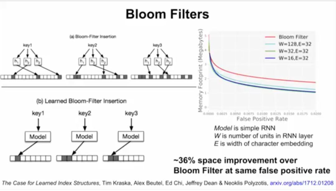 接下来,Jeff Dean介绍了谷歌大脑的研究,用ML模型替代数据库组件。他们将神经网络应用于三种索引类型:B树,用于处理范围查询;哈希映射(Hash-map),用于点查找查询;以及Bloom-filter,用于设置包含检查。
