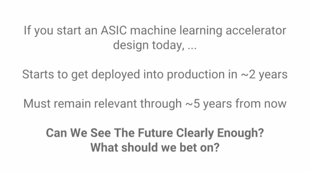 在Arxiv上的机器学习的论文逐年增长,速度已经超过摩尔定律。如果你现在开始做ASIC,大约两年后能够流片,而这款芯片需要能够持续使用3年。换句话说,必须看清楚未来5年的技术发展,但是,我们能够看清吗?怎样看清?