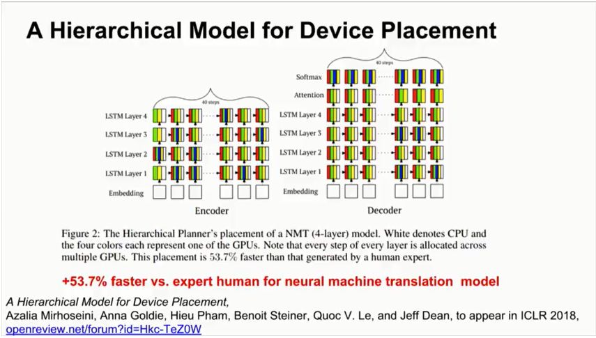 之后,谷歌大脑将上述研究泛化,提出了一个层次模型(Hierarchical Model),将计算图有效地放置到硬件设备上,特别是在混合了CPU,GPU和其他计算设备的异构环境中。这项研究提出了一种方法,叫做“分层规划器”(Hierarchical Planner),能够将目标神经网络的runtime最小化,这里的runtime包括一次前向传播,一次BP,一次参数更新。