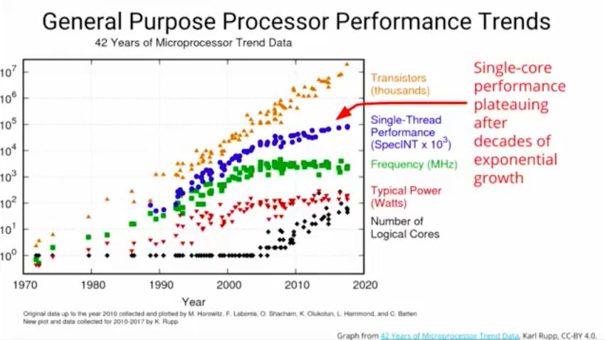 演讲从机器学习系统开始。他首先介绍了通用处理器性能趋势,指出经过数十年的指数式增长,单核性能保持稳定。