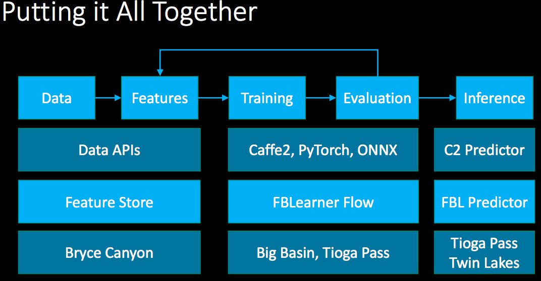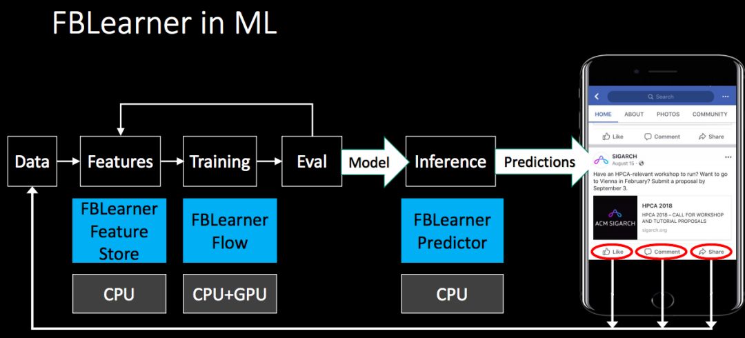 最后,作为Facebook AI基础设施总监的贾扬清,介绍了Facebook如何利用机器学习,包括Facebook用于机器学习的硬件和平台、框架。作为支撑20亿用户的超大平台,Facebook的机器学习流程如下: