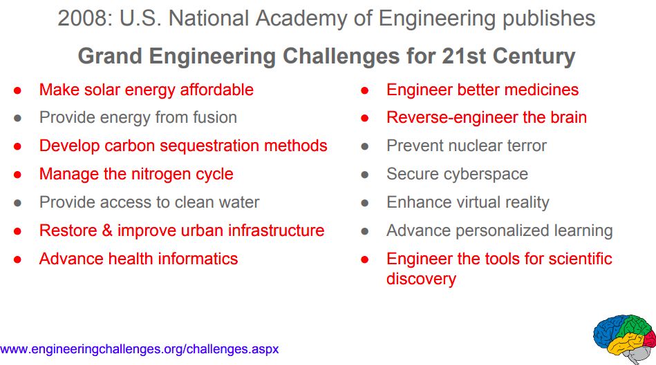 在2008年美国工程院列出的“21世纪重大工程难题”中,14个问题里,至少有8项,也就是一半多,都能用到机器学习,甚至用机器学习去解决,包括环境问题、健康、医药、城市基础设施,以及人脑的逆向工程。