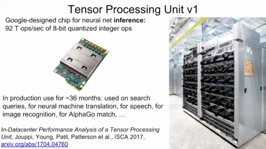 为此,谷歌研发了TPU,第一代TPU是用于神经网络推理的芯片:92 T ops/秒 of 8位 量化整数运算,用于搜索请求、神经机器翻译、言语和图像识别、AlphaGo比赛等。