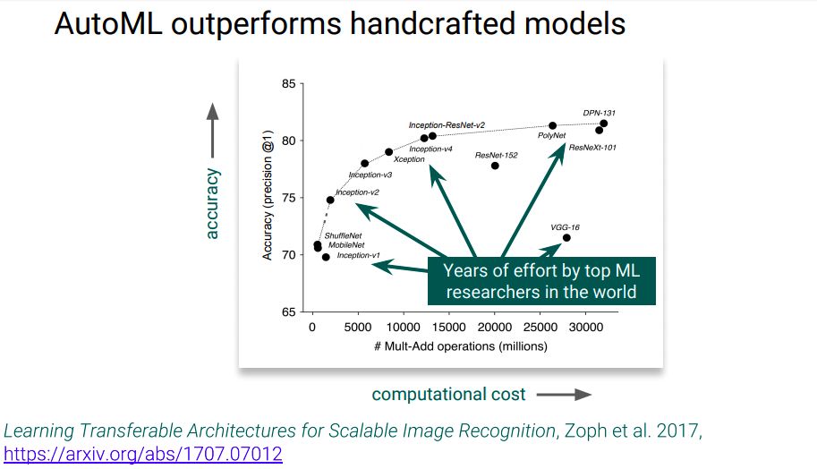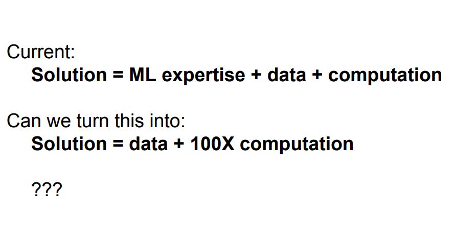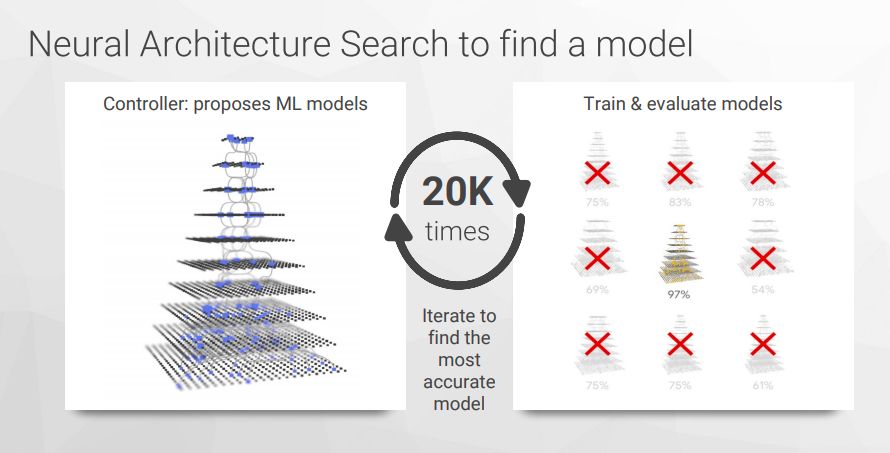 目前,机器学习的解决方案是由ML专家设计模型或网络,在大数据和超强计算力的支撑下得出。但是,众所周知,ML专家少,如何应对这一点。从去年开始,Jeff Dean就在他的演讲中频频提到“要用计算力替代ML专家/ML专业知识”,而事实证明,这一点确实可行。