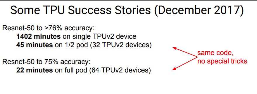 Cloud TPU是谷歌设计的硬件加速器,为加速、拓展特定tensorflow机器学习workload而优化。每个TPU里内置了四个定制ASIC,单块板卡的计算能力达每秒180 teraflops,高带宽内存有64GB。某些程序只会对CPU、GPU、TPU进行微小的修改,某些程序通过同步数据并行度进行缩放,而不能在TPU pod上进行修改。