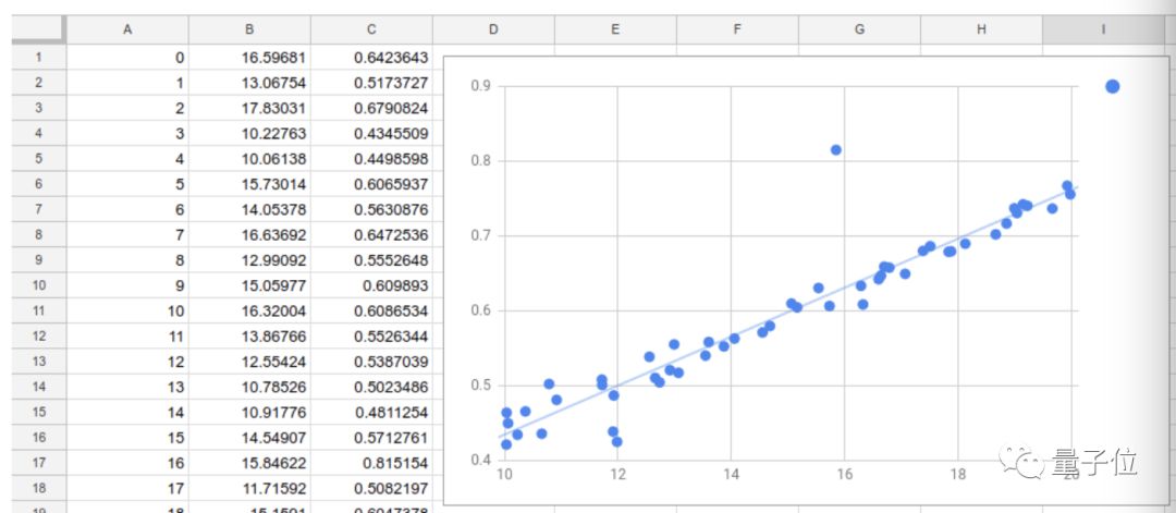 这个.csv文件只有三行,index,distance和force。我在谷歌表格中导入这个文件,创建了带趋势线的散点图,这样就能了解数据的分布情况了。