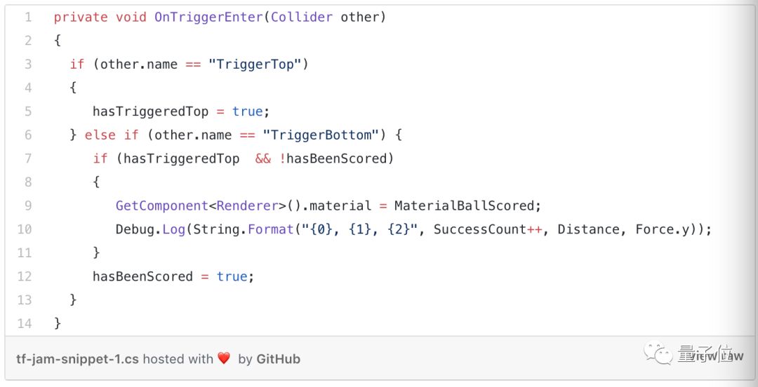 如上图所示,在Unity编辑器中,肉眼可见绿色的隐形触发器。可观察到触发器分为上下两个,这样就能计算出球从篮筐顶部到底部落下消耗的时间。这两个触发器可在/Assets/BallController.cs中的OnTriggerEnter中查看。
