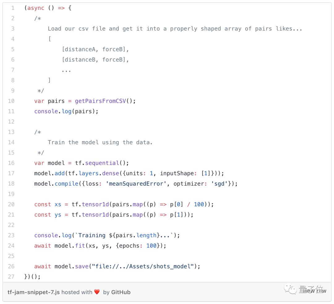 在你喜欢的编辑器中打开tsjs/index.js文件,这是一个基于数据训练模型的脚本successful_shots.csv。训练和保存模型的方法如下: