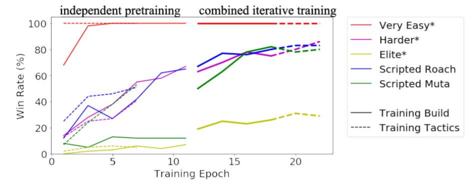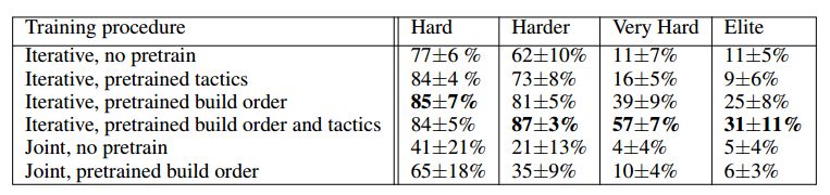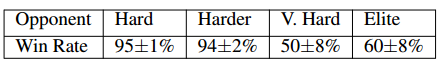表 4:不同训练过程下和不同难度内建 bot 的最终胜率(3 个种子,每个种子 100 场比赛的平均值)。