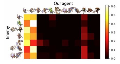 图 4:学习的军队组成。显示每种单位类型的总产出与战斗单位总数量的比值。