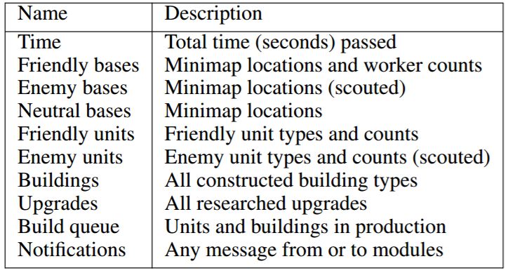 为了保证 AI 和人类的公平比较,Vinyal 等人(2017)定义了 PySC2 的观察输入,使其和人类玩家看到的相似,包括屏幕的图像特征地图以及小地图(例如单位类型、玩家身份等),和一系列非空间特征,如收集矿物的总数量。由于过去的动作、过去的事件和视野外的信息对于决策很重要,但不能直接从当前观察获取,智能体需要发展高效的记忆。尽管从经验中学习这样的记忆是可能的,我们认为适当手工设计的记忆也能达到类似的目的,同时也降低了强化学习的负担。表 3 列出了更新者维护的示例记忆。一些记忆(例如构建队列)可以从过去采取的动作推断出来。一些记忆(例如友好单位)可以通过检查所有单位名单推断出来。其它记忆(例如敌对单位)需要进一步处理 PySC2 观察,并与侦察模块协作才能推断出来。