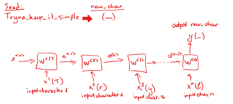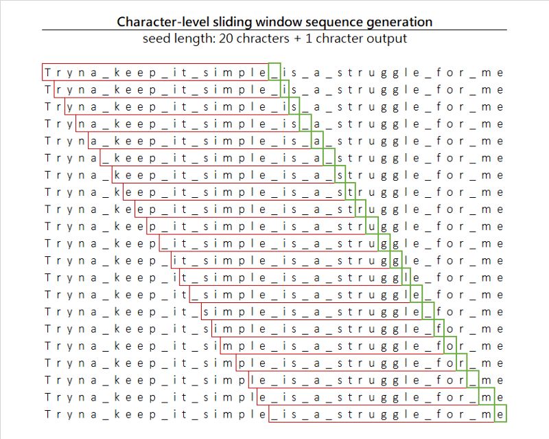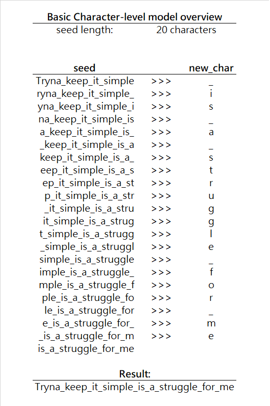字符层次模型的输入是一系列字符seed(种子),模型负责预测下一个字符new_char。接着使用seed + new_char生成下一个字符,以此类推。注意,由于网络输入必须保持同一形状,在每一次迭代中,实际上我们将从种子丢弃一个字符。下面是一个简单的可视化:
