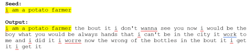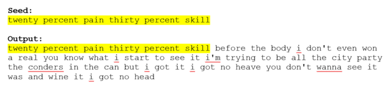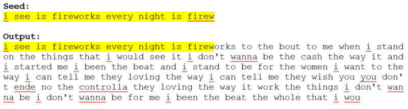 训练网络之后,我们将使用某个随机种子(用户输入的字符串)作为输入,让网络预测下一个字符。我们将重复这一过程,直到创建了足够多的新行。