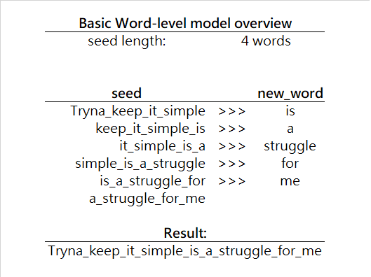 单词层次模型几乎和字符层次模型一模一样,只不过生成下一个单词,而不是下一个字符。下面是一个简单的例子: