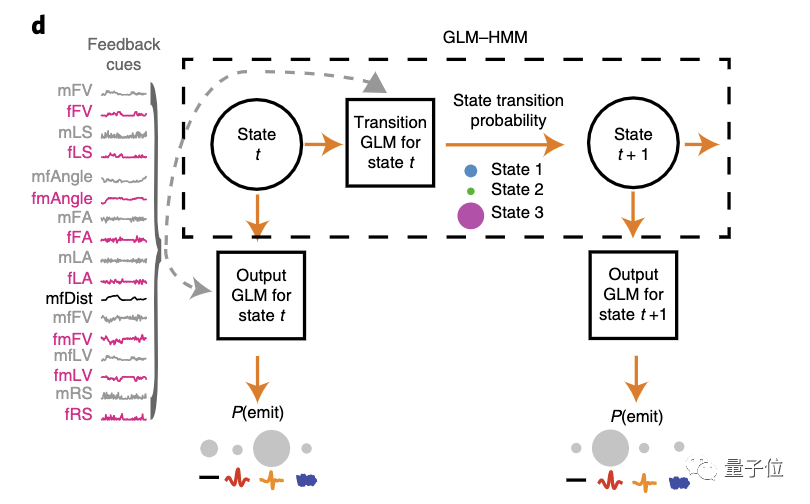 同时,每个状态还有单独的多项式GLM,可以产生另一个映射关系:反馈线索-从当前状态到下一状态转移的概率。