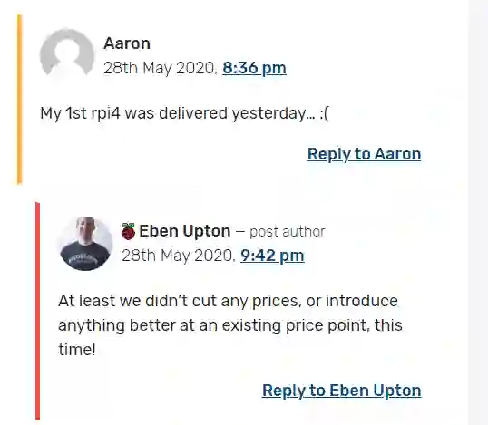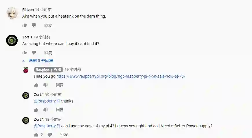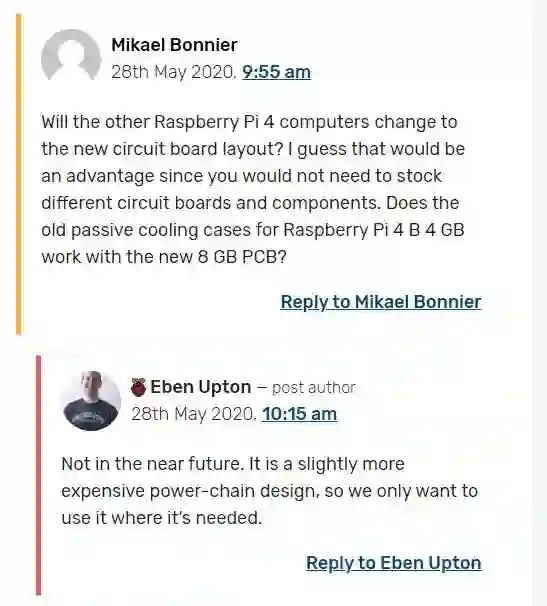 也有网友表示,随着版本的更新迭代 RAM 的增大,树莓派 4 之后是否会改变现有电路板布局?官方也表示在短期内不会,因为相较于此前版本,耗电量的上升可以忽略不计,保持现有电路设计完全没问题。