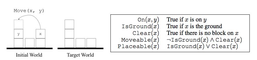 为了更加具体地讨论,该研究以经典的积木世界(blocks world)问题为例。如图 1 所示,给定一堆积木,我们可以移动一块积木 x 并将其放在另一块积木 y 的上方或地上,前提是 x 可以移动并且 y 上可以放积木。我们将这种操作称之为 Move(x, y)。如果一块积木上没有其他的积木,那么这块积木就是可以移动的,而且上面可以放其他积木。地上一直可以放积木,也就是说我们可以把所有积木都放在地上。给定积木世界的初始状态之后,我们的目标就是通过一系列移动操作将其转换为目标状态。