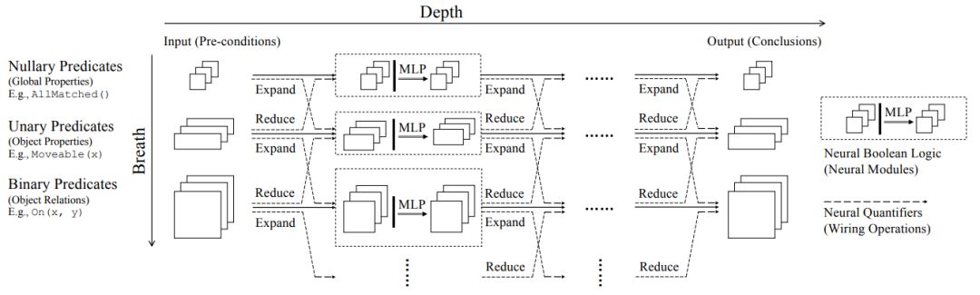 图 2:神经逻辑机(NLM)的整体架构。在前向传播中,NLM 将 object 属性和关系作为输入,并执行序列的逻辑演绎,最后输出归结属性或 object 间的关系。