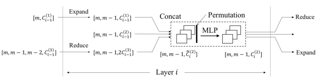 图 3:NLM 中的计算模块,以第 i 层的二元谓项为例。其中 C 的上下标分别表示组与层级,C 表示不同组与层级下的输出谓项数。[·] 表示张量形状。