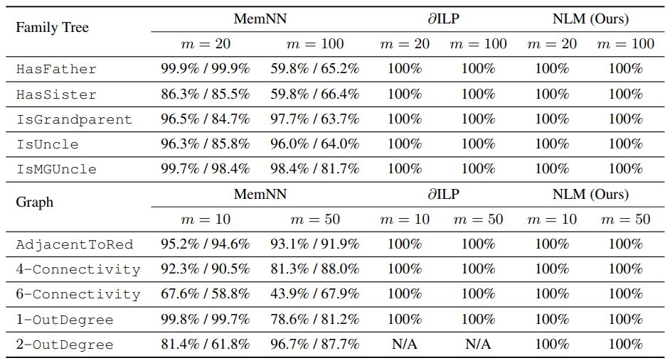 表 1:在家族树和图推理任务中,MemNN、∂ILP 和 NLM 的对比,其中 m 表示家族树或图的规模。∂ILP 和 NLM 的性能均优于神经基线模型,在测试集上达到了 100% 的准确率。注意:N/A 标记表示 ∂ILP 无法在 2-OutDegree 中扩展。