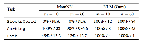表 2:在积木世界、整数排序和寻找最短路径任务中,MemNN 和 NLM 的性能对比。
