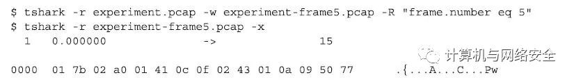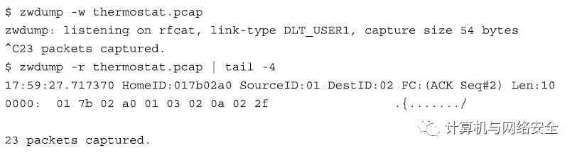 要评价这种类型的攻击所造成的影响,需要捕获一些数据包并“重播”一下,然后观察目标Z-Wave设备的行为。例如,把温度计设置为恒温,向其发送“降低1度”的指令,然后观察随着每个重播数据包的发送,该温度计的设定温度是不是持续降下来了。如果从捕获数据包的文件中找到一个特定的数据包,然后想将这个数据与其他剩余的数据包隔离开,那么只需要使用Wireshark工具集中的tshark工具就可以将所选的这一个或几个特定的数据包单独再生成一个新的数据包捕获文件。在下面的示例中,我们就从原始捕获的数据包文件中提取出帧顺序号为5的那个数据包帧,并将该数据包保存到一个单独的数据包捕获文件中。其操作命令格式的效果如下: