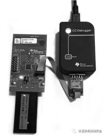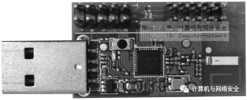 KillerZee工具并没有使用CC1110DK的硬件,而是使用了CC1111芯片,结合“得克萨斯仪器”公司USB接口的“评估模块集”(Evaluation Module Kit,EMK)作为其攻击硬件,该设备的实物图如图14所示。CC1111EMK设备使用一个类似于CC1110DK芯片的芯片,但是增加了USB功能,另有一些引脚的针用于程序的烧录。有一个灵活的按钮可以用于自定义功能。不幸的是,这款CC1111EMK芯片相比于CC1110DK芯片少了一些功能,但对于执行一些Z-Wave网络上数据包的捕获操作,已有的功能绰绰有余。