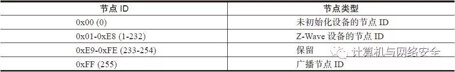 跟在“HomeID”字段后面的是1个字节长度的“源节点ID”(Source NodeID)字段,该字段表示的是Z-Wave节点在本地独有的源地址,Z-Wave节点的分配策略详见表3。当一个Z-Wave节点添加到某个Z-Wave网络时,该设备的“节点ID”应该设置为0,“主控制设备”会在范围1~232中找一个未使用的值分配给该新加入节点,供其作为“节点ID”使用。而该设备也会在随后的通信中,自始至终地使用这个值作为其“节点ID”,直到网络关闭或退出网络。因此,一个Z-Wave网络中,节点的最大数目是232个,如表3所示。