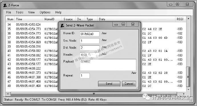 Z-Force工具包括数据包的发送功能,要进行“重播攻击”的时候,在该软件的“工具(Tools)|发送数据包(Send Packet)”菜单选项里,输入目标网络的“HomeID”(即界面上的“Home ID”)、“源节点ID”(即界面上的“src Node”)、“目标节点ID”(即界面上的“Dst Node”)、“帧控制”(frame control)的值(就是Z-Wave数据包头中的“有效载荷头部”Header字段,也是界面上的同名项),上述各值都是以十六进制格式表示,接下来输入要发送数据包的有效载荷的内容(即界面上的“Payload”),输入发送重复次数,然后单击“发送”按钮,程序的界面如图16所示。