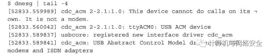 下一步,将CC1111EMK设备设置为bootloader模式,设置的方式是按住设备面板上的按钮,然后将设备插入到计算机上一个可用的USB端口,一旦插好,就可以放开按钮。这时,会看到CC1111EMK设备外壳上绿色的LED类就会亮起来,这时查看Linux操作系统上的内核日志,会看到有一个新的串口设备在系统中注册,其效果如下所示:
