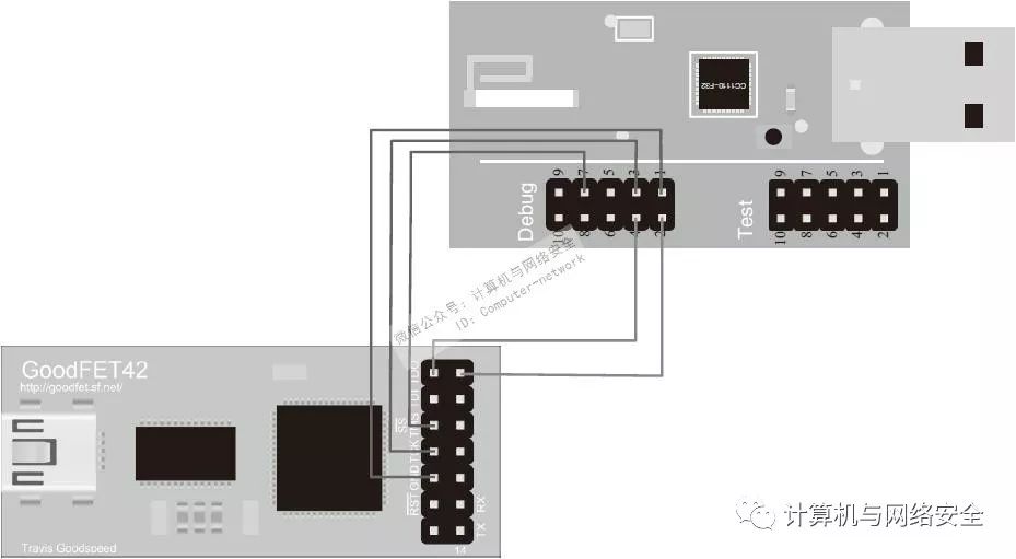 图15 CC1111EMK工具与GoodFET工具的连线示意图