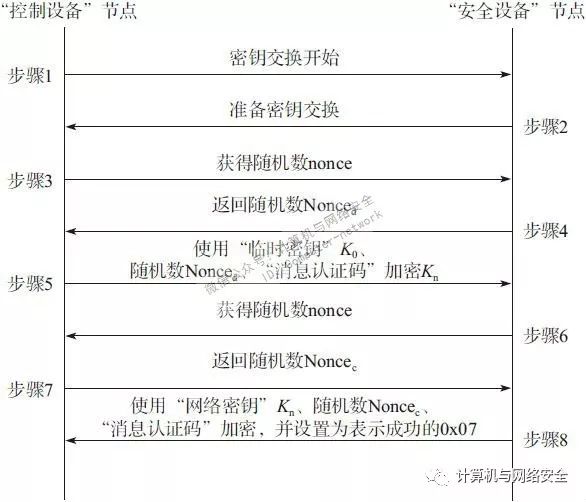 当“安全设备”从“控制设备”处接收到加密的网络密钥Kn和“消息认证码”之后,“安全设备”会验证“消息认证码”,并使用K解密所接收到的消息。然后“安全设备”会注册解密后的Kn,并将其作为当前的密钥。下一步,“安全设备”反过来请求“控制设备”给一个随机数,“控制设备”也会返回一个随机数Noncec(Noncec即“Controller Nonce”,意指由“控制设备”产生的随机数)。拿到这个随机数以后,“安全设备”会使用Kn加密一个“密钥设置完毕”(该消息的“命令”字段值为0x07)的消息发送给“控制设备”。“控制设备”在接收到“密钥设置完毕”消息以后,使用Kn,加上“消息认证码”一起对数据内容进行解密,解密后看到消息是“密钥设置完毕”就知道双方的密钥交换过程成功。