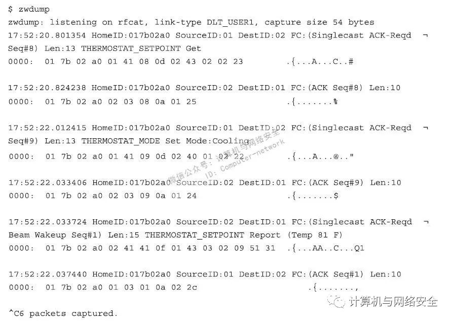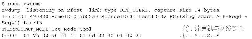 这款Z-Wave温控计实现COMMAND_CLASS_THERMOSTAT_MODE功能,该功能用来设置温控计的操作模式。一个“控制设备”可以通过发送命令来控制温控计,改变预设将要达到的温度,所改变的值可以是一个或多个数值,例如加热、冷却、只通风、空气干燥,节省加热或冷却,以及更多功能的值。要完成上述操作,攻击者可以使用zwdump工具来捕获和保存这些行为的通信数据包,该命令的格式和执行效果如下所示: