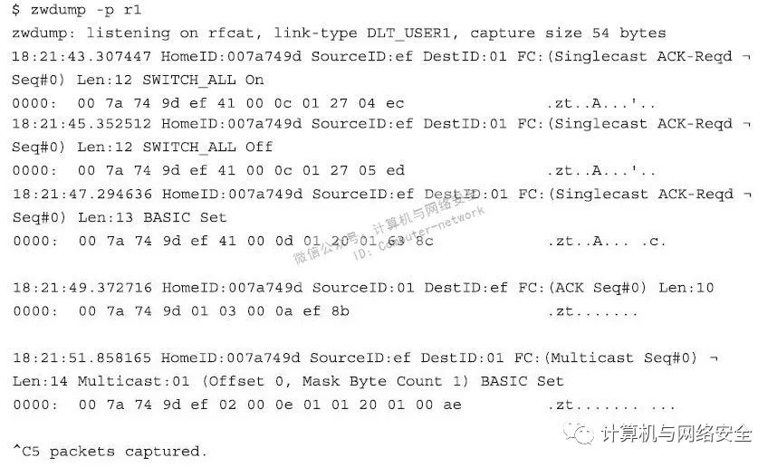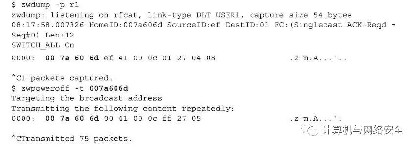 使用固件已经刷新过的CC1111EMK接口与已经安装好的KillerZee程序,就可以开始对Z-Wave网络进行窃听了。