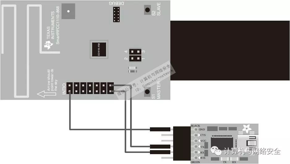 在完成RfCat工具和GoodFET工具的安装后,就可以通过连线将CC1111EMK设备与GoodFET设备连接起来。