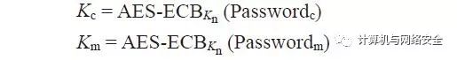 在加载“网络密钥”Kn以后,“安全设备”生成两个额外的密钥,Kc和Km,(其中,Kc是“数据包加密密钥”,Km是“信息认证密钥”),然后使用“高级加密标准-电子密码本模式”(Advanced Encryption Standard-Electronic Codebook Mode,AES-ECB)加密算法生成密码。