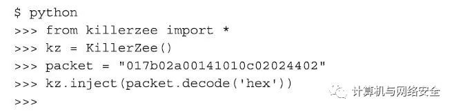 使用KillerZee工具可以完成注入任意数据包的能力,攻击者就有机会采取特定的数据帧来完成一个想要的行动,并由简单的工具自动化完成。接下来,我们看两个例子,这两个例子所用的工具都是KillerZee项目中所使用的工具。