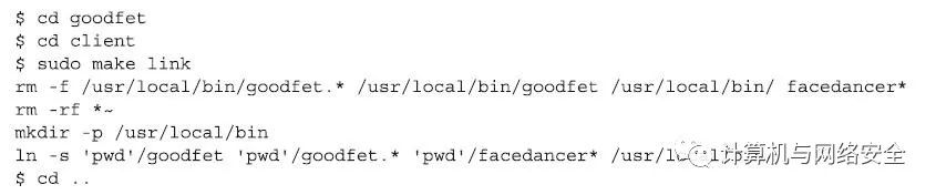 下一步,切换到GoodFET客户端的目录,创建一个到GoodFET客户端的“符号链接”(symbolic link),其命令格式及运行效果如下。